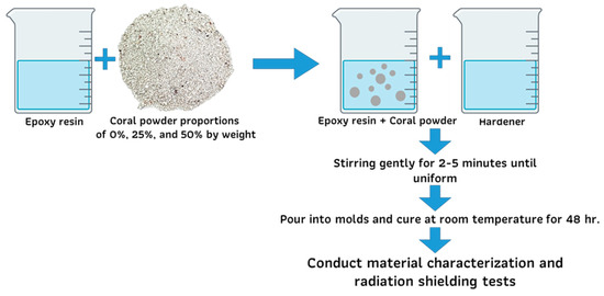 In a clean and contaminant-free container, the epoxy resin and hardener were mixed thoroughly by gentle stirring for 2–5 min until a uniform mixture was achieved. The pre-calculated coral powder was then gradually added to the mixture while using a mechanical stirrer to ensure homogeneity and prevent the formation of agglomerates. The mixing process continued for an additional 5 min to achieve the consistent distribution of the coral powder within the matrix. The prepared mixture was subsequently poured into molds and allowed to cure at room temperature for a duration of 48 h. After curing, the samples were ready for further material characterization and radiation shielding performance evaluation, as detailed in Figure 3.