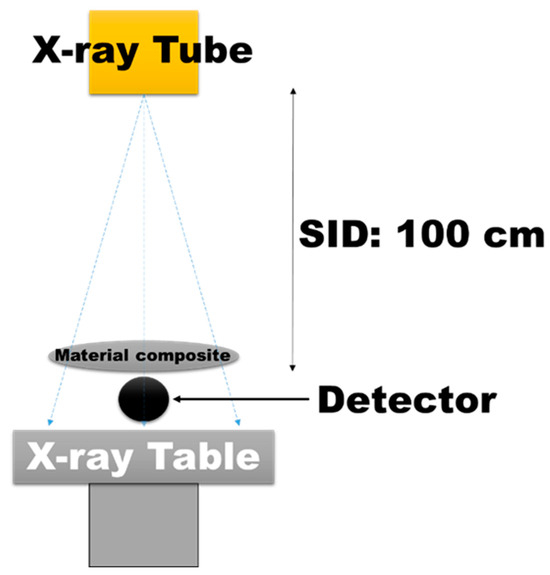 The experimental setup involved the use of a medical X-ray diagnostic unit (RADspeed Fit, Shimadzu Corporation, Kyoto, Japan) configured to operate at exposure parameters of 60, 80, 100, and 120 kVp with a fixed tube current of 5 mAs. The source-to-image distance (SID) was maintained at a constant 100 cm throughout the experiment. A Radcal AccuGold detector was positioned to fully encompass the X-ray beam output, ensuring complete coverage of the field size. Prior to conducting the tests, both the X-ray unit and the radiation detector were calibrated according to the manufacturers’ guidelines to ensure accurate and reliable measurements, as illustrated in Figure 4.