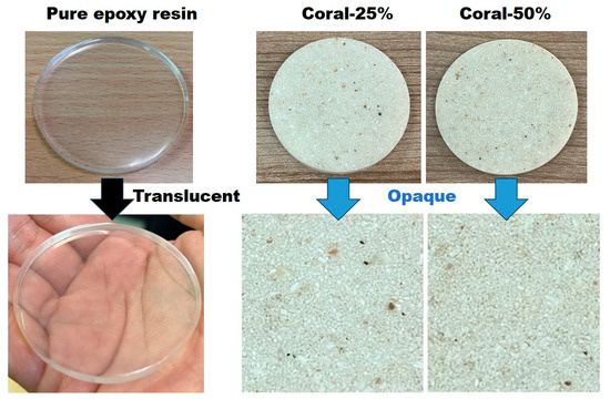 The prepared epoxy–resin matrix was evaluated after incorporating coral powder at varying weight fractions of 0%, 25%, and 50%. As shown in Figure 6, the matrix without coral powder (0% weight fraction) exhibits a clear and transparent appearance, indicative of pure resin properties. At a 25% weight fraction of coral powder, the composite transitions to a slightly opaque texture, with visible fine particles uniformly dispersed throughout the matrix. When the coral powder content increases to 50%, the composite becomes fully opaque, with a dense distribution of coral particles, demonstrating significant filler integration.