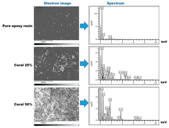The Energy-Dispersive X-ray Spectroscopy (EDS) analysis of the epoxy–resin matrix and coral composites with coral powder weight fractions of 0%, 25%, and 50%, as presented in Figure 8, provided significant insights into the elemental distribution and compositional changes with a varying filler content.