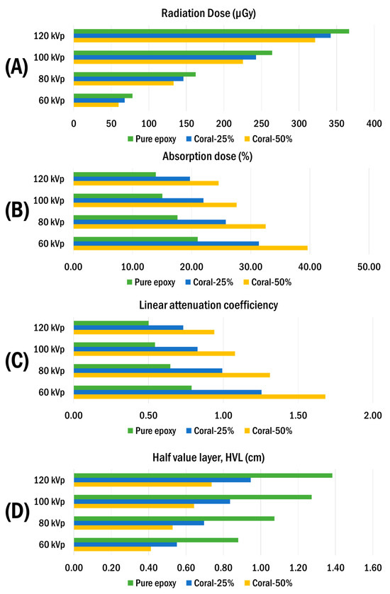 The absorption dose analysis followed a similar trend, with the percentage absorption increasing with the coral filler content. At 60 kVp, the pure epoxy sample achieved an absorption rate of 21.06%, while the 25% and 50% coral composites demonstrated improved absorption rates of 31.40% and 39.63%, respectively (Figure 9B).