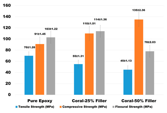 The mechanical properties of epoxy composites reinforced with varying weight fractions of coral-derived calcium carbonate fillers (0%, 25%, and 50%) were assessed in terms of tensile strength, compressive strength, and flexural strength. The findings, presented in Figure 10, illustrate the impact of filler content on the mechanical behavior of the composites.