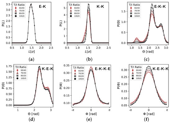 Across all T/I ratios, the only intra-chain distribution that changes shape is the EKK angle potential. We see slight variations in width for the K−K bond and K−E−K−K dihedral distributions. Intra-chain distributions are obtained from united atom single-chain simulations at a reduced temperature of . (a) E−K bonds, (b) K−K bonds, (c) E−K−K angles, (d) K−E−K angles, (e) E−K−K−E dihedrals, and (f) K−E−K−K dihedrals.