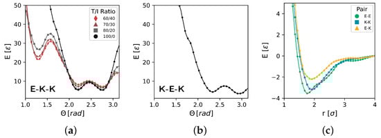 Figure 4 highlights the angle and pair potentials resulting from IBI and MSIBI, respectively. Figure 4a shows four different E−K−K angle potentials in the CG model as a function of the T/I ratio. An emergence of a second, meta-stable energy well at smaller angles is observed as the T/I ratio decreases. Additionally, the energy barrier between the large-angle and small-angle wells appears to slightly decrease with decreasing T/I ratios. For the K−E−K angle, we only derive a single potential that is used across all T/I ratios studied in this work. Potentials derived using IBI and MSIBI may not necessarily conform to commonly used functional forms, and can often have multiple wells and peaks that may be unphysical. Here, we find sensible potentials that are consistent with a soft-core Lennard-Jones-like pair potential. The E−E and K−K pair potentials exhibit a similar shape, with the E-E beads having a slightly smaller effective radius and a deeper energy well. In the E−K pair, we observe a similar effective radius to K−K, with a significantly shallower energy well. The parameters obtained from fitting the Boltzmann inversion (Equation (1)) of bond length (Equation (2)) and dihedral (Equation (3)) distributions are shown in Table 3.