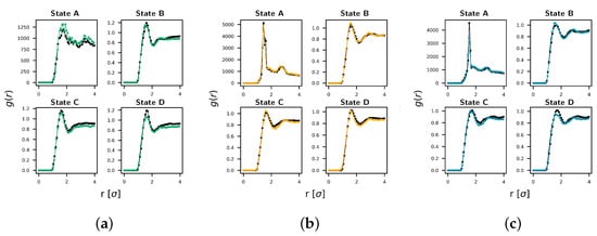 Across all pairs and state points, we observed good agreement between radial distribution functions. Target RDFs from the UA model are shown in black, and RDFs from the CG model are shown by the colored lines. Pair correlations between bead types are as follows: (a) E−E, (b) E−K, and (c) K−K.