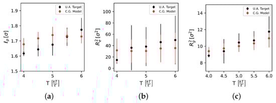 (a) Persistence length, (b) squared end-to-end distance, and (c) squared radius of gyration comparisons between UA (black) and CG (red) models over a temperature range with a T/I ratio of 80/20.