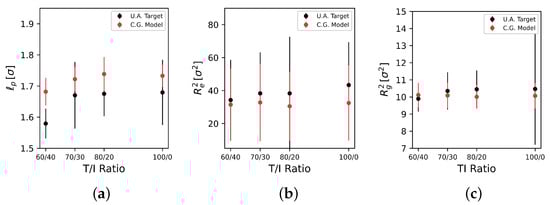 (a) Persistence length, (b) squared end-to-end distance, and (c) squared radius of gyration comparisons between UA (black) and CG (red) models over the T/I ratio range studied at a constant reduced temperature of .