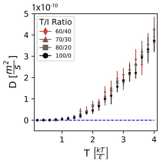 Self-diffusion coefficients measured across several temperatures for each T/I ratio. , identified where begins to exponentially increase from (dashed blue line), shows no notable dependence on T/I ratio.