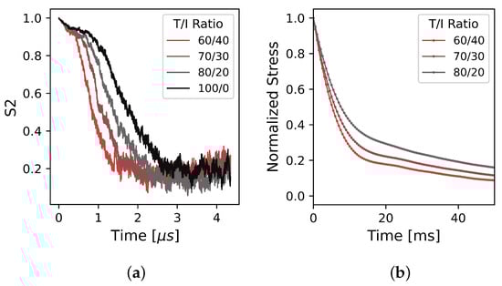 To validate the CG model’s representation of how the T/I ratio affects , we simulate polymer stress relaxation and compare against experimental stress relaxation rheology. This indirect comparison is chosen due to the difficulties in measuring due to the finite size effects of the solid–liquid interface on melting [13]. Practically, because , crystallization kinetics, and relaxation times all depend on the same underlying mechanism of chain stiffness determining cooperative movement length scales [71,72,73], we focus here on relaxation dynamics to infer the degree to which a coarse model can capture the T/I ratio effect on all three of these properties. Stress relaxation experiments as a function of the T/I ratio are performed experimentally and computationally, and both methods are explained below.