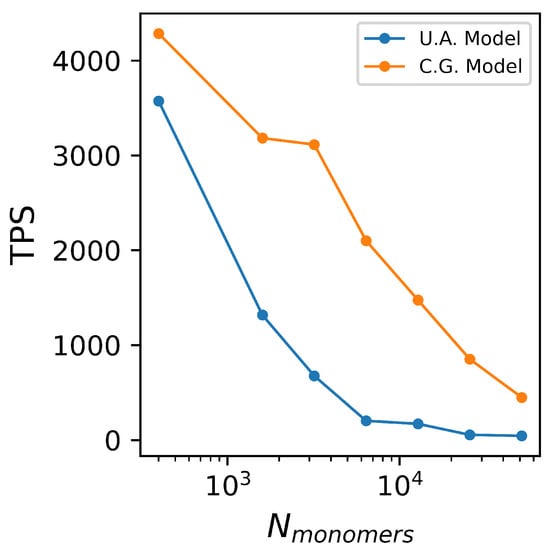 Raw performance was measured by time steps per second (TPS) using NVIDIA Tesla-P100 GPUs with 12 GB of VRAM, and the comparison between UA and CG models is shown in Figure 11. TPS improvement ranges from a factor of 2 at small system sizes to a factor of nearly 15 at system sizes of 30,000 monomers, where the CG model has a TPS of 851 while the UA model is only 54 TPS.