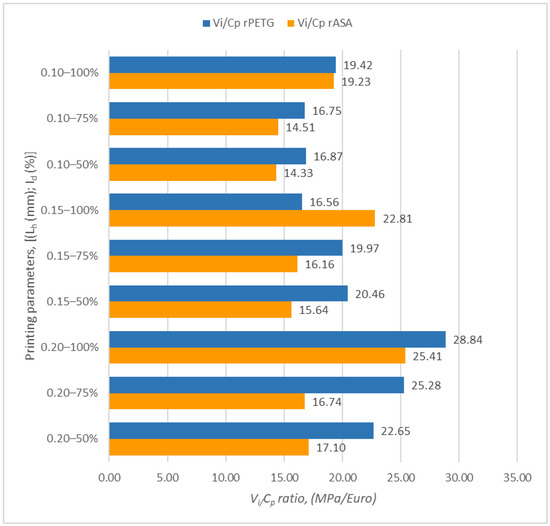 By comparing the minimum with the maximum result of the Vi/Cp ratios obtained for the samples manufactured from rPETG and those corresponding to the rASA samples, it was observed that the Vi/Cp ratios of the rPETG samples are superior by a percentage range between 11.87 and 13.49% compared to those obtained for the rASA samples.