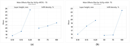 Main effects plots for tensile strength: (a) rPETG; (b) rASA.