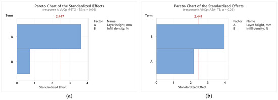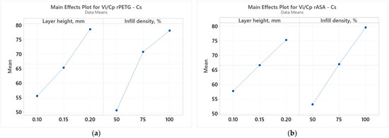 Analyzing the graphs presented in Figure 6, it is observed that the variable FDM parameters (Lh and Id) significantly affect the results of the Vi/Cp ratios of compression samples additively manufactured from rPETG (Figure 6a) and rASA (Figure 6b). According to Figure 6a, both FDM parameters have a significant influence on the results of the Vi/Cp ratios of compression samples manufactured from rPETG; however, the parameter with a greater influence is the infill density percentage (Id). Studying the graphs from Figure 6b, we observe that the considered FDM parameters (Lh and Id) significantly influence the results of the Vi/Cp ratios of compression samples additively manufactured from rASA, but the infill density percentage (Id) is the parameter with biggest influence on the results of the Vi/Cp ratios. The same conclusions are drawn from the analysis of the Pareto charts presented in Figure 7.