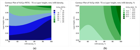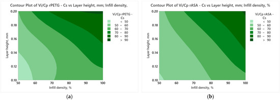 Figure 8 presents contour plots obtained using the results of the Vi/Cp ratios of the additively manufactured samples of rPETG and rASA and the variable FDM parameters presented in Table 1.