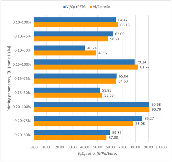 The FDM parameters considered (Lh—layer height and Id—infill density percentage) influence the tensile strength of samples manufactured from rPETG and rASA, as well as the electrical energy consumption [41,48]. The results of the Vi/Cp ratio are presented in Table 5 and Table 6.