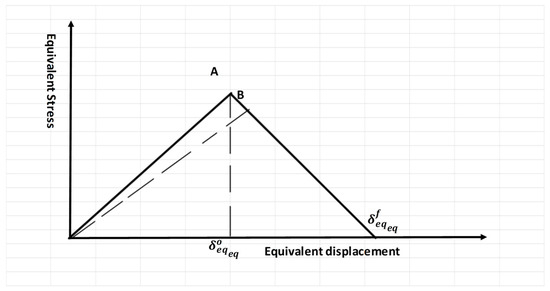 Every failure involves crack initiation and crack growth, both of which are governed by the principles of damage development. Crack initiation is described by the Hashin model, which assumes a linear response. Once failure starts, the damage initiation criteria are applied according to the damage evolution laws, which also reduce the need for refining mesh sizes [27,28,29]. In Figure 1, a typical linear tensile separation response is shown, as defined by the four failure modes of Hashin’s progressive damage criteria. The slope of the first line represents the start of damage, corresponding to the elastic region. The second slope, which is negative, indicates failure beyond the elastic region, commonly referred to as the softening behavior in polymers.
