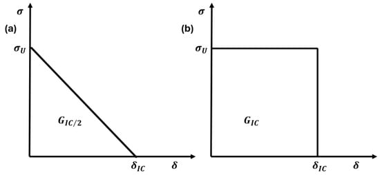 The cohesive zone model was developed based on cohesive stress at the crack tip and the crack opening displacement (). It is commonly referred to as the softening function for quasi-brittle materials, such as tough ceramics, ice, and composite laminates. A specimen fails when the crack opening displacement reaches the critical value (). The most commonly used cohesive laws are two-parameter cohesive laws, which depend on the surface release energy (GIC) and the stress at the crack tip () [1]. The cohesive zone model distributes the stored energy in the material around the crack tip. Examples of the most common cohesive laws, i.e., the linear and constant cohesive laws, are shown in Figure 2a,b.