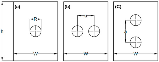 Plate with two holes: (a) central hole, (b) transversely located hole, and (c) longitudinally located hole.