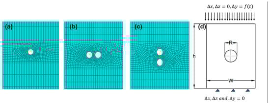 The composite material domain consisted of a rectangular 3D plate with central holes, as shown in Figure 4a, and another configuration with two holes arranged in the transverse and longitudinal directions, illustrated in Figure 4b and Figure 4c, respectively. The distance between the two holes (a) ranged from 3.5 d to 7.5 d, where d, the hole diameter, was 5 mm according to [6]. The sample domain was modeled as a continuum shell, consisting of 3074 elements for the transverse holes and 2974 elements for the longitudinal holes, as shown in Figure 4b and Figure 4c, respectively. A linear SC8R element type was used with dynamic explicit step loading, along with hourglass control and element deletion criteria. A tabulated amplitude was applied. For the sample with a central hole, as shown in Figure 4a, which was used to predict the size effect and validate the model accuracy, the central hole diameters were varied at 5 mm, 7 mm, 10 mm, and 15 mm. The same mesh area was used for all configurations, with a total of 3346, 3330, 3230, and 2962 elements, respectively. The load was applied to one end of the plate, whereas the opposite end was fixed, as illustrated in Figure 4d.