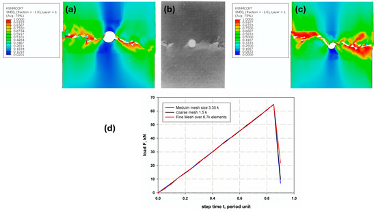 The primary objective of this study was to evaluate the bearing capacity of composite laminates rather than the mechanisms of delamination behavior. Although finer meshes can capture more detailed crack paths and ply failures, the chosen mesh density was sufficient to achieve accurate results for global bearing capacity, which was the main focus of this investigation. Figure 5a shows the damage contour for the medium mesh compared with the failure mode observed in an experimental study [6] (Figure 5b). In contrast, Figure 5c presents the results for a finer mesh with more than 6000 elements. The differences between the two have minimal impact on accuracy, whereas the medium mesh significantly reduces computational time and cost. This can be attributed to the implementation of the damage evaluation criteria in the model, which ensures reliable results even with moderate mesh densities (see Figure 5d).