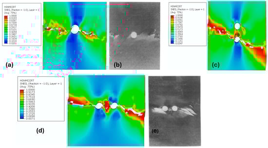 Damage predicted using HDFEM for (a) central holes, (b) experimental data [6], (c) two longitudinally aligned holes, (d) two transversely aligned holes, and (e) experimental data [6].