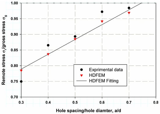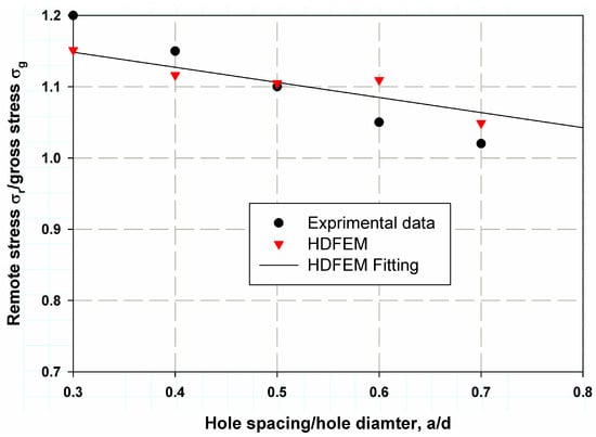 HDFEM validation for the specimen with two transverse holes, compared with the experimental work of Soutis et al. [6].