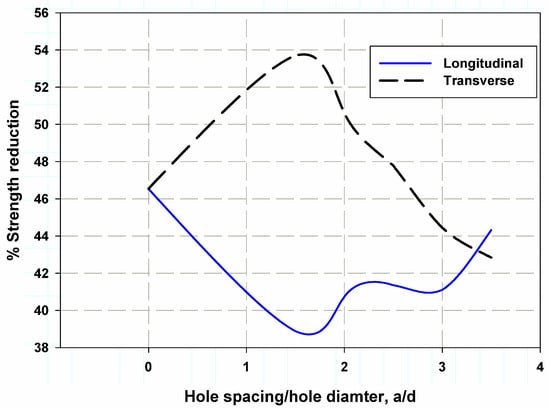 The failure modes were simulated through the holes, with the Mises stress shown as a red-colored stress concentration region (see Figure 7). Figure 10 illustrates the effects of existing holes on stress distribution and nominal strength. It was clear that adding additional holes in the longitudinal direction of the central holes reduced the overall strength of the plate. The percentage of strength reduction varied with the distance between the holes. However, for transverse holes, the trend was the opposite, as increasing the distance between the holes resulted in an increase in strength.