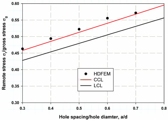 The nominal strength of the composite plate with two open holes subjected to compression load can be predicted using the correction function , which was obtained by HDFEM fitting through linear regression, as previously discussed.