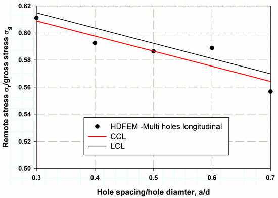 Figure 11 and Figure 12 show the predicted nominal strength for two transversely oriented holes using the proposed models based on the following cohesive laws: LCL and CCL. CCL was found to provide more accurate data and predictions than LCL for both transversely and longitudinally oriented holes. The average error for CCL was 2.5%, whereas for LCL, it was 9% when the two holes were transversely aligned, as shown in Figure 10.