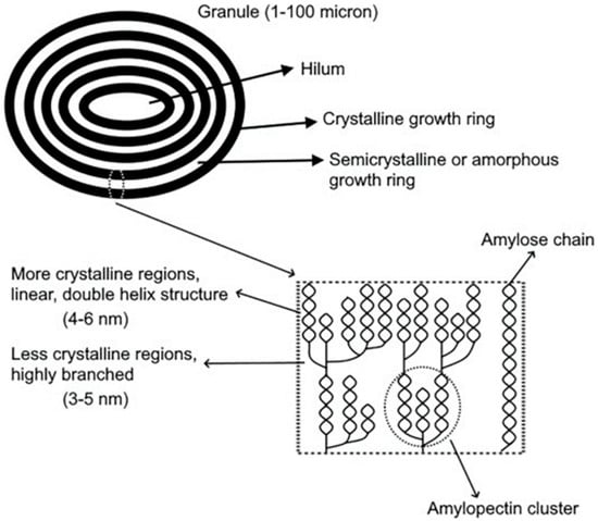 The size, shape, structure, amylose-to-amylopectin ratio, and degree of crystallinity of starch granules are influenced by their botanical origin. The degree of crystallinity, determined by the amylose-to-amylopectin ratio and starch origin, plays a critical role in influencing the functionality and processing behavior of starch [28,29]. At the supramolecular level, amylose and amylopectin form granules that can vary widely in size, reaching diameters of up to 100 μm. These granules grow outward from a central nucleus known as the hilum. During granule development, amylose integrates into the structure, with branching being more prominent in less crystalline, semicrystalline, or amorphous regions. In contrast, more crystalline regions are characterized by adjacent chains forming double helices of the linear or branched polymer, which are packed tightly in ordered arrays (Figure 1).