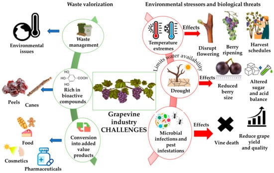 The implementation of sustainable waste management solutions in viticulture is hampered by several factors, including the seasonal nature of waste generation, the high cost of extraction technologies, and the logistical challenges associated with transporting and processing large volumes of biomass []. Additionally, the stability and bioavailability of extracted compounds can vary, which impacts their commercial viability in different applications [,]. Consequently, although waste valorization offers promising avenues for sustainability, the practical and economic barriers associated with these processes need to be addressed to make them accessible to the industry at large. Figure 2 graphically presents the major challenges of the grapevine industry.