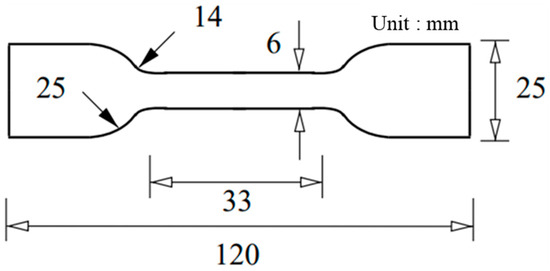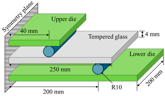 The material properties of the tempered glass and PVB film were experimentally obtained to construct an analytical model of the PVB-laminated glass. In addition, 4-point bending tests were conducted on tempered glass to investigate the effect of the strain rate. Experiments were conducted at three different strain rates (0.001, 0.01, and 0.1/s). Tempered glass cannot undergo additional post-processing because of its brittleness. Therefore, the experimental die set was produced by scaling the ISO 11228-3 standard [16] 4-point bending die set to fit the size of the prepared tempered glass, as shown in Figure 1. The PVB film material properties were obtained via quasi-static and high-speed tensile tests that were conducted at various strain rates (0.004, 1, 10, 100, 200, and 400/s) to consider the high strain rate during impact. Figure 2 shows a schematic of the tensile test specimen, following the ISO 573-3 standard. Quasi-static tensile tests were performed using a universal testing machine (UTM), as shown in Figure 3a, whereas high-speed tensile tests were conducted using a high-speed teTnsile testing machine available at the Korea Institute of Materials Science (KIMS), as depicted in Figure 3b. The strain was measured via the 2D digital image correlation (DIC) method. The material properties of the PVB film were obtained based on the strain rate, and fitting was performed using the Mooney–Rivlin fitting equation.