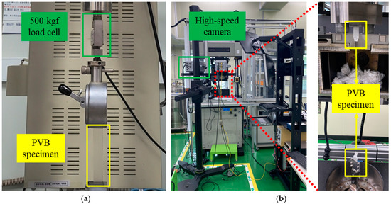 Experimental setup for a PVB film tensile test: (a) quasi-static strain rate; (b) high strain rate.