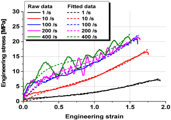 The material constants for each strain rate were derived by fitting the stress–strain curve of the PVB film obtained from the tensile tests at different strain rates, as shown in Table 1. Figure 5 presents both the raw stress–strain data from the tensile test and data fitted using the Mooney–Rivlin equation. The fitted data were applied as material properties that accounted for the strain–rate dependency in the numerical analysis model.