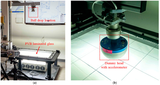 The front glasses of most automobiles, including trams, are primarily composed of Polyvinyl Butyral (PVB) laminated glass [9,10,11,12]. This material combines tempered glass with a PVB film to achieve the high strength of tempered glass while the PVB film prevents glass fragments from scattering during collisions. Due to these characteristics, PVB laminated glass not only ensures sufficient strength for vehicle safety but also prevents secondary damage caused by glass fragments during collisions. For this reason, it is widely used in vehicle windshields. Consequently, analysis methods that consider collisions, particularly those involving pedestrians, are well-established. For analyzing the effects of pedestrian-vehicle collisions, dynamic head impact tests are widely utilized. These tests simulate a pedestrian’s head using a dummy head, which is impacted against actual vehicles or automotive glass. By analyzing pre- and post-impact velocity and acceleration, the test evaluates the force and impulse exerted on the dummy head. This makes it an essential consideration in designing vehicles to minimize risks in pedestrian collisions.