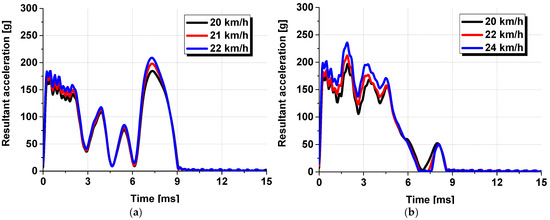 Time–acceleration results from the dynamic head impact test: (a) center impact results; (b) side impact results.