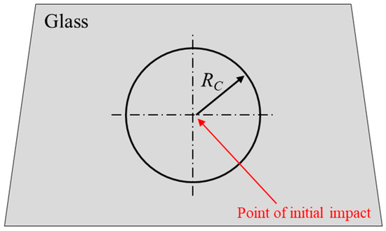 The PLC criterion, which Pyttel et al. [18] called the nonlocal criterion, is an effective model for simulating the fracture behavior of glass caused by the impact between PVB-laminated glass and a pedestrian’s head. Owing to its highly brittle nature, tempered glass exhibits nonlinear fracture characteristics in which cracks propagate at a high speed once a certain point of external impact is reached. Consequently, accurate simulations using general fracture methods are impossible. Hence, an energy-based threshold criterion was added to the main criterion. If this criterion is not met, no fractures occur. Pyttel et al. determined the fracture occurrence threshold based on the energy accumulation of elements within a certain radius from the point where the initial impact occurs on the glass. Figure 8 illustrates the initial impact point on the glass and the radius of the circle used to calculate the energy accumulation around that point. The first impact between the ball and tempered glass follows the major stress condition represented in Equation (2):