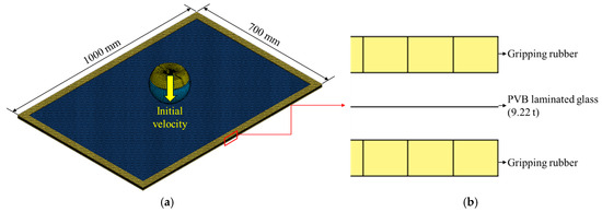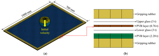Numerical analysis model for the dynamic head impact test: (a) overall modeling; (b) structure of PVB-laminated glass in the direction of thickness.