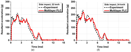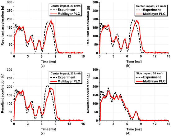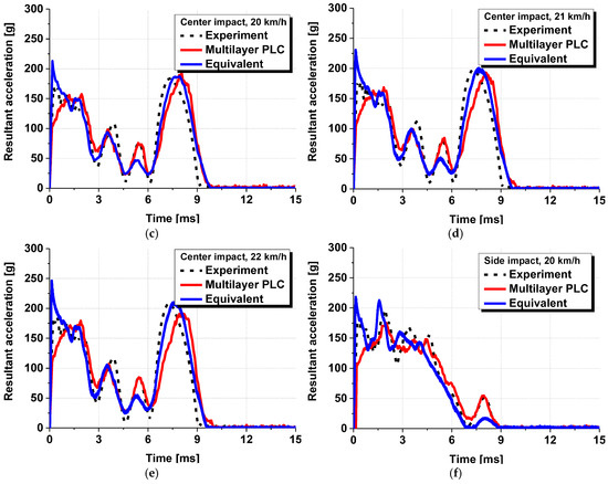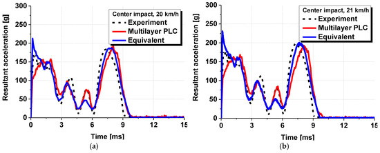 A numerical analysis identical to the one conducted in Section 3.1 was conducted by applying the equivalent model proposed in this study. Figure 12 shows the numerical analysis model with the equivalent model applied, in which the PVB-laminated glass was modelled as a single layer. All other analysis conditions remained the same, and six cases from the previous analysis were conducted repeatedly. Figure 13 presents the time–acceleration graphs measured from the head dummy to depict the results of the actual dynamic head impact test, PLC analysis model, and equivalent model. The results demonstrated that the acceleration tendency of the equivalent model closely matched the experimental results and those of the existing PLC model. The trends aligned under various experimental conditions. Moreover, in terms of analysis cost, the PLC model required approximately 8 h to complete the analysis, whereas the equivalent model reduced the analysis time to less than 1 h for the same case, thus, demonstrating a dramatic decrease in the analysis cost.