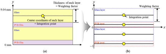 A single-layer structure was modelled for the equivalent model, including the material properties of the tempered glass and PVB film. In the proposed model, the integration points used in the shell elements were used to simulate each layer of the multilayer model. The location, thickness, and material properties of each integration point were controlled to simulate the multilayer structure; therefore, it played a role similar to that of the multilayer model. In LS-DYNA, the positions and thicknesses of each integration point should be converted to scaled values, with the total thickness of the structure being normalized to a range from −1 to 1. Thus, the total thickness of the PVB-laminated glass, that is, 9.22 mm, was normalized to 1, and 0 mm was normalized to −1. Then, the center points of each tempered glass and PVB film layer were calculated and applied. However, due to the single-layer structure of the proposed equivalent model, it is difficult to directly apply the failure criteria specific to the glass part in the PLC model. As a result, the equivalent model cannot simulate glass fracture behavior. Nonetheless, dynamic head impact tests considering TRAM operating speeds demonstrated no fracture of the PVB laminated glass, validating the equivalent model’s applicability. Figure 11 illustrates the structure of the PVB-laminated glass and numerical structure of the equivalent model simulated using integration points.