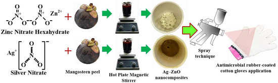 The liquid rubber compound and chemicals were prepared as shown in Table 1. Natural latex rubber (2000 g) was placed in the container for 1–2 min, to allow for ammonium to evaporate. After that, the 60% natural latex was poured to form a mixture with 10% KOH, 20% C12H23KO2, 50% S, 50% ZDC, 40% Wingstay@L, 50% ZnO, and 1% distilled water. This mixture was continuously stirred (60 rpm) as slurry for 48 h. The cotton gloves were inserted onto a solid mould for controlling the finger and palm shape. They were then dipped into the liquid rubber compound that covered the palm for 10 s, and then, the rubber gloves were sprayed with Agmgt, Znmgt, and Ag+Znmgt nanocomposites as shown in Figure 1, before all gloves samples were baked in the oven at 70 °C for 3 h. The analysis of crystallisation, quantity (wt%), and structure of the samples used scanning electron microscopy (SEM, EDX, Quanta 400, Prague, Czech Republic), with XRD (PANalytical Empyrean, Almelo, The Netherlands).