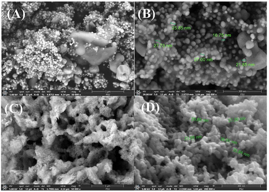 SEM image samples of Agmgt and Znmgt nanocomposites. (A,B) show the SEM images for Agmgt at 50,000× and 200,000× magnifications. (C,D) show the SEM images of Znmgt at 50,000× and 200,000× magnifications.