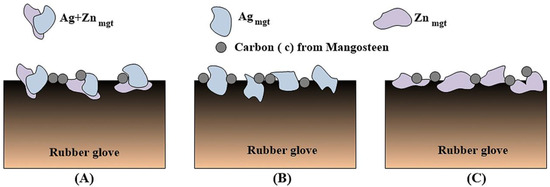 Table 3 summarises the outcomes from physical testing of rubber gloves under the ANSI-ISEA 105-2016 standard to evaluate resistance to abrasion, cuts, tears, and punctures. Testing for abrasion resistance achieved level 1 at a load of 500 g for 100 cycles. Testing for cut resistance achieved level 3 at 1000 g, while testing for tear resistance achieved level 3 at 50 Newtons. Finally, testing for puncture resistance achieved level 4 at 100–149 Newtons. A spraying technique was used to apply coatings with Ag+Znmgt, Agmgt, or Znmgt on the rubber gloves, as shown in Figure 5. Figure 5A shows the Ag+Znmgt combined with carbon deposited on the rubber glove with Ag+Znmgt sharply formed, which impaled easily into the rubber glove texture. Figure 5B shows the Agmgt combined with carbon deposited on the rubber glove with Agmgt that stuck on the surface of the rubber glove. Figure 5C shows Znmgt combined with carbon deposited on the rubber glove, where Znmgt also stuck on the surface of the rubber glove. Regarding the Ag+Znmgt shape, it may be shaped in the ball milling process for 12 h.