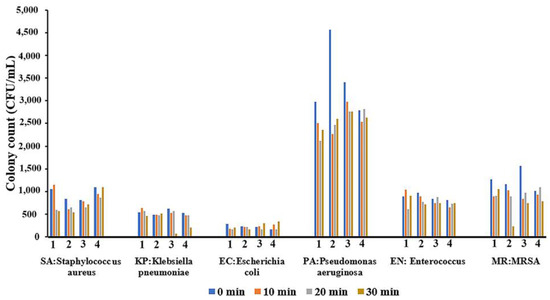 A comparison of (1) the bactericidal activity of the untreated glove, (2) Ag+Znmgt, (3) Znmgt, and (4) Agmgt spray coated on gloves, at contact times of 0, 10, 20, and 30 min.
