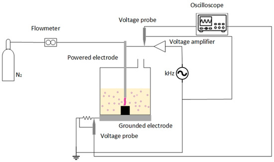 3 are placed. The vessel is positioned on a stainless steel plate, which is the grounded electrode of the reactor. The powered electrode is a stainless-steel tube of ¼ in diameter that is immersed in the solution and through which the gas enters the liquid and produces bubbles. The electrode is powered by a high-frequency generator (30 kHz signal generator IGBT143, Martignoni Elettrotecnica, Vestone, Italy) through a voltage amplifier (IGBT163, Martignoni Elettrotecnica). A high-voltage 1000:1 passive probe (P6015A, LeCroy, Chestnut Ridge, NY, USA) is adjusted on the power line to record the applied voltage, while the current flow of the system is calculated by recording the voltage drop (100:1 passive voltage probe, Hameg HZ53, Hameg Instruments, Mainz, Germany) across a 6.5 Ω resistance attached between the stainless-steel plate and the ground. Recording the applied voltage and the current flow allows the calculation of the process power consumption [