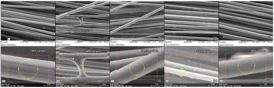 To evaluate the effectiveness and impact of each recycling method on the fibre surface, samples were examined using SEM (TM3030Plus Tabletop Microscope, HITACHI, Tokyo, Japan) at magnifications up to ×1000. By scanning the surface of the samples, it was possible to identify the amount of residual resin remaining after the recycling process and to assess any potential surface damage. Five different samples per case were analysed, scanning the entire surface area of each and capturing representative images, which are presented in the Results section.