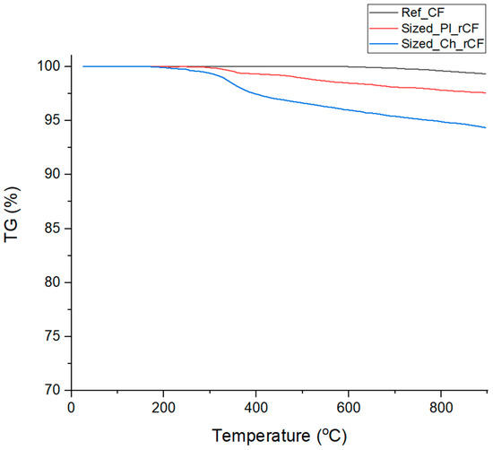 TGA (NETZSCH Proteus Thermal Analysis 8.0.2, Selb, Germany) was used to evaluate total mass loss at a specific temperature range, which is an indication of resin residue after the completion of the recycling process, as well as a quantitative determination of the polymeric coating that has been added to the recycled fibres. Furthermore, the structural integrity of the fibres can also be identified through this method, as any detection of significant weight loss would indicate potential fibre structural damage. TGA analysis was conducted in a nitrogen (N