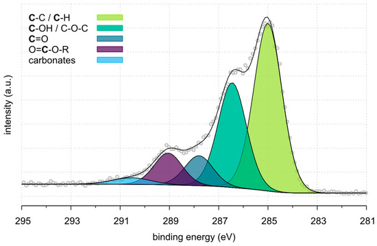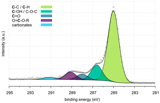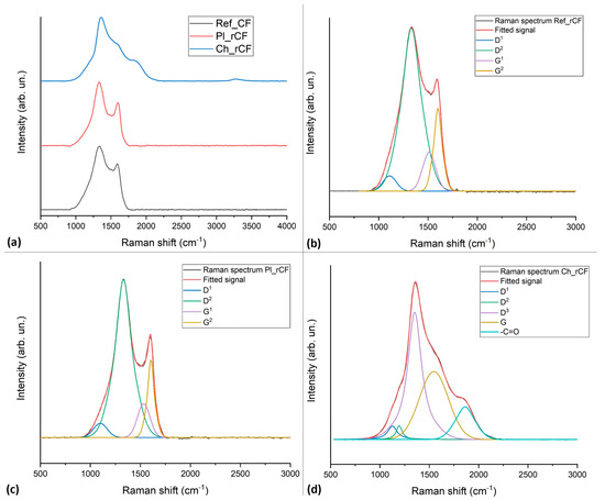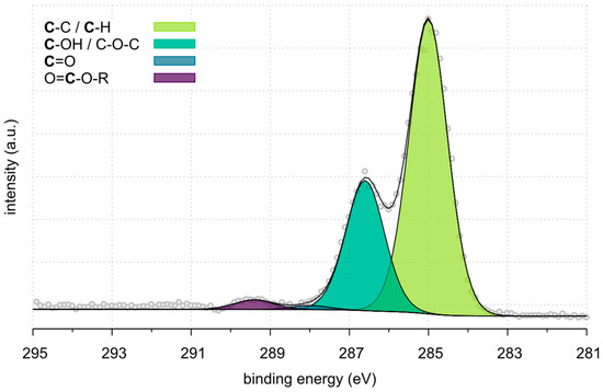 XPS measurements were performed to identify the surface functional groups of carbon fibres at three different stages: Ref_CF, Pl_rCF, and Sized_Pl_rCF. This technique, with its shallow sampling depth of a few atomic layers, provides both qualitative and quantitative insights into surface modifications. The measurements were conducted using a UHV Prevac spectrophotometer (Rogow, Poland) equipped with a VG Scienta XM 780 monochromator and an Al Kα radiation source (1486.6 eV). High-resolution (HR) XPS spectra were recorded at a pass energy of 50 eV, with an energy step size of 50–100 meV. The binding energy scale was calibrated by setting the binding energy of the aliphatic carbon C1s peak to 284.8 eV. All spectra were analysed using CasaXPS Version 2.3.23 PR1 software. Due to limited availability, this method was applied specifically to Ref_CF, Pl_rCF, and Sized_Pl_rCF, as they demonstrated the best results from SEM and TGA analysis.