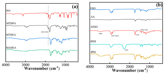 FT-IR spectra of (a) MA, MTHPA, MTHEA, MAHEA, MATEO and (b) ESO, AA, AESO, IPDI, MATEO, IPM.