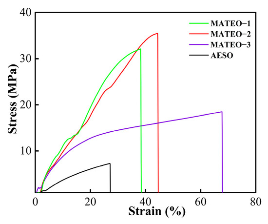 As observed in Figure 4 and Table 2, the elongation at break and tensile strength of the MATEO cured films increased for all ratios of cured films compared to the AESO cured films. The MATEO-2 cured film had the best overall mechanical properties, with an elongation at break of 44.32% and a tensile strength of 35.36 MPa, and the related elongation at break and tensile strength were 1.64 and 4.90 times greater than those of the AESO cured film, respectively. The overall elongation at break of these three ratios of MATEO resins ranged from 31% to 68%. In a previous study, anhydride derivatives were found to have lower Young’s modulus and ultimate tensile strengths with higher ultimate strains compared to DGEBA-based epoxy monomers. They also exhibited highly enhanced properties compared to conventional DGEBA-based epoxy resin systems, with more than three times higher stresses and strains [13]. In conclusion, the addition of appropriate amounts of anhydride derivatives into AESO resin could improve the mechanical properties of the AESO-based cured films. In practical application, the ratio of AESO and anhydride derivatives could be adjusted according to the actual application needs in order to achieve the application performance of AESO-based UV-curing materials.